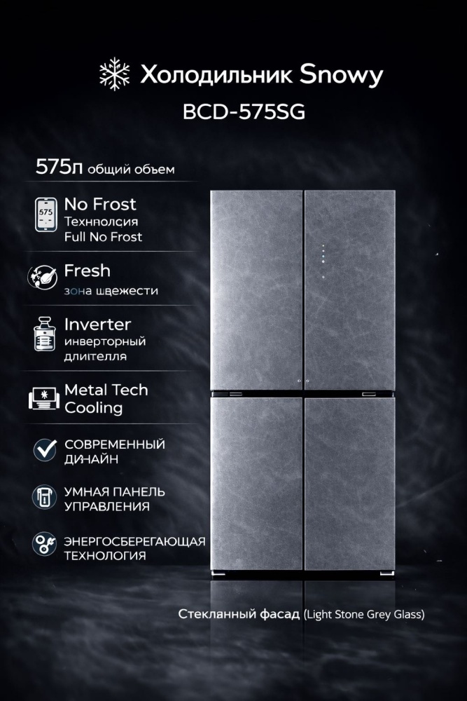 Откройте дверь к свежести и удобству!with Snowy BCD-575 SG – ваш личный помощник в сохранении продуктов! ✅ Идеальная температура зон: свежий ассортимент всегда под рукой! ✅ Экономия энергии без ущерба комфорту! ✅ Элегантный дизайн серого цвета гармонично впишется в любой интерьер кухни. Выбирайте качество и стиль вместе со Snowy!
