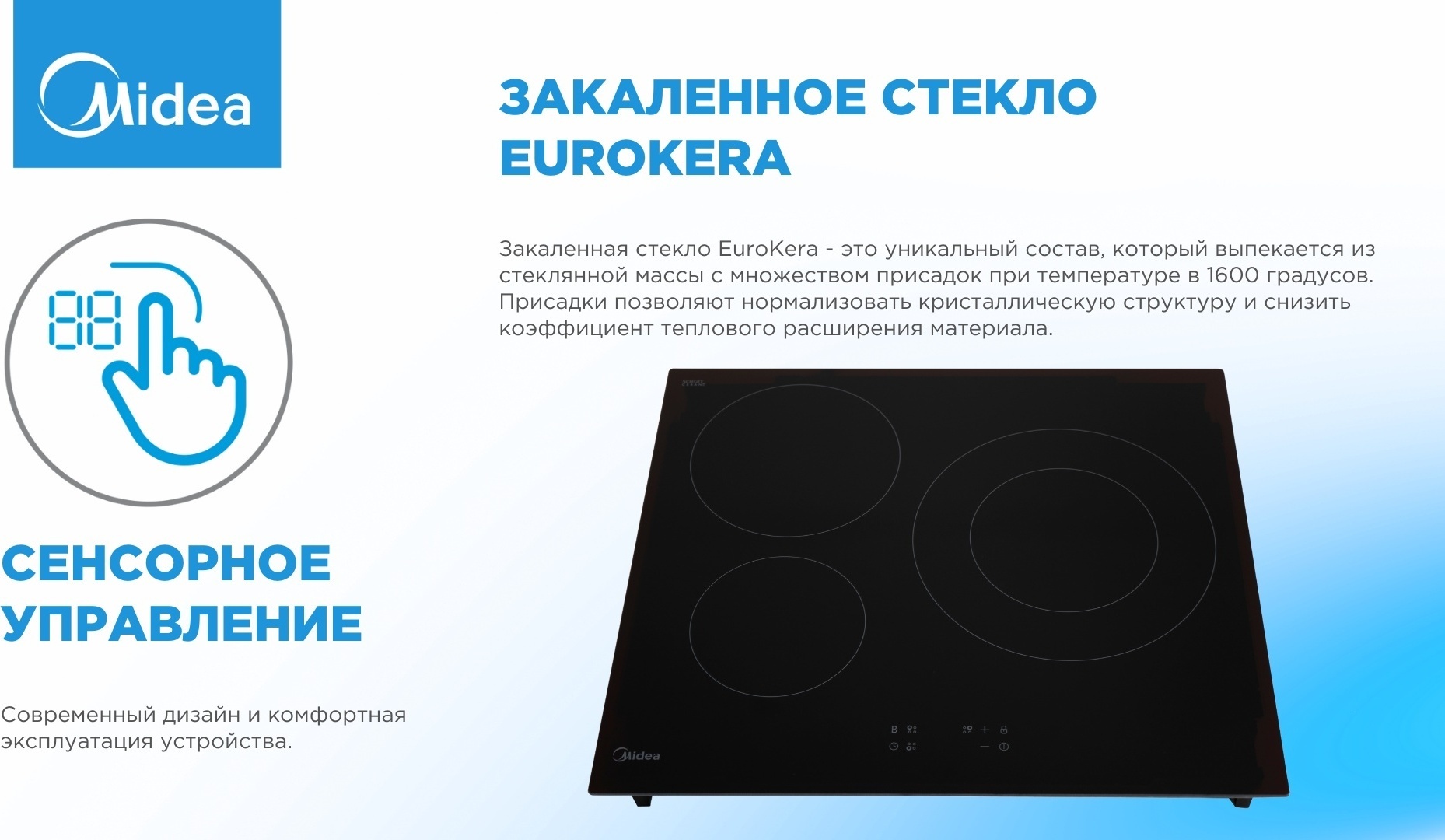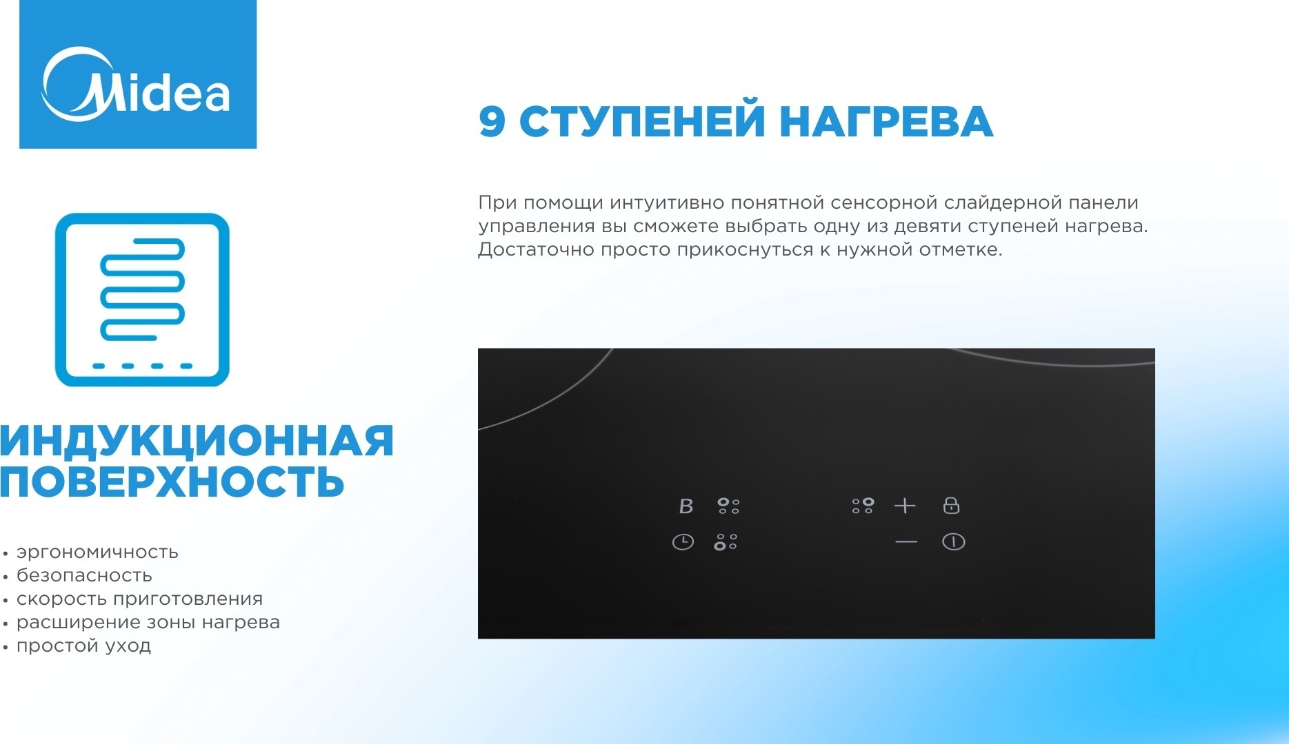 - защитное отключение, индикатор остаточного тепла, кнопка блокировки панели