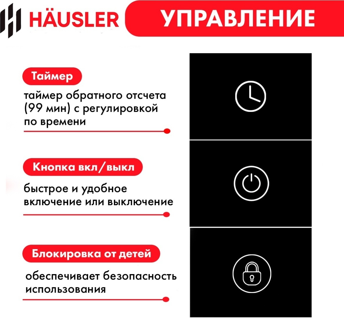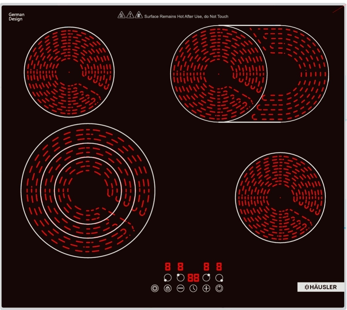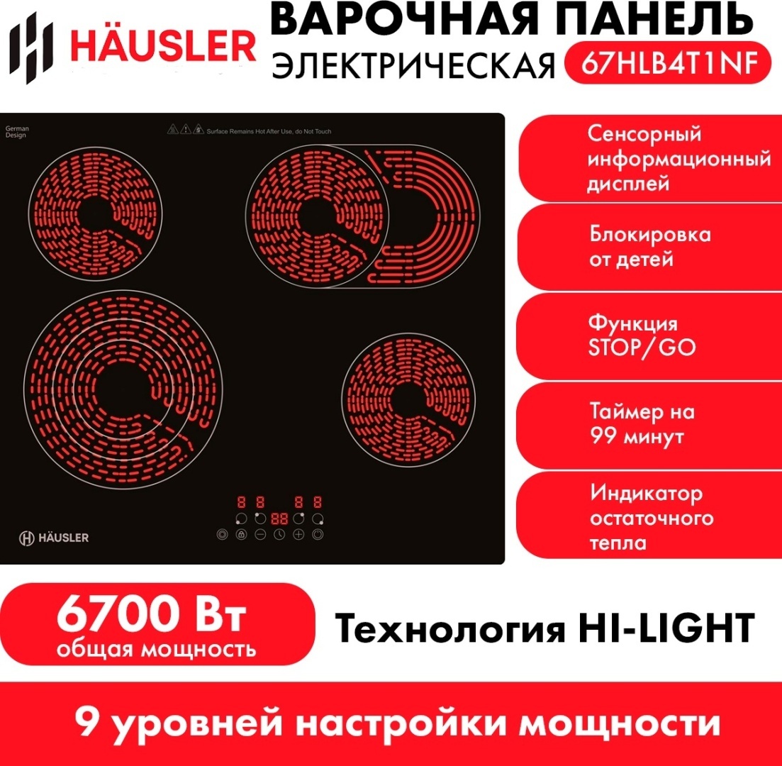 - защитное отключение, индикатор остаточного тепла, кнопка блокировки панели